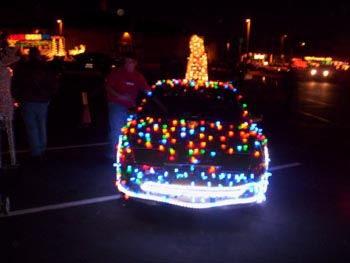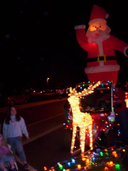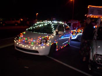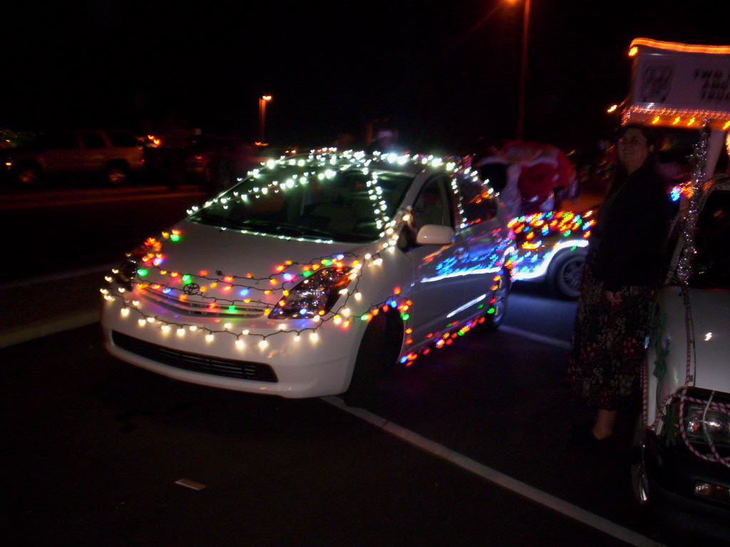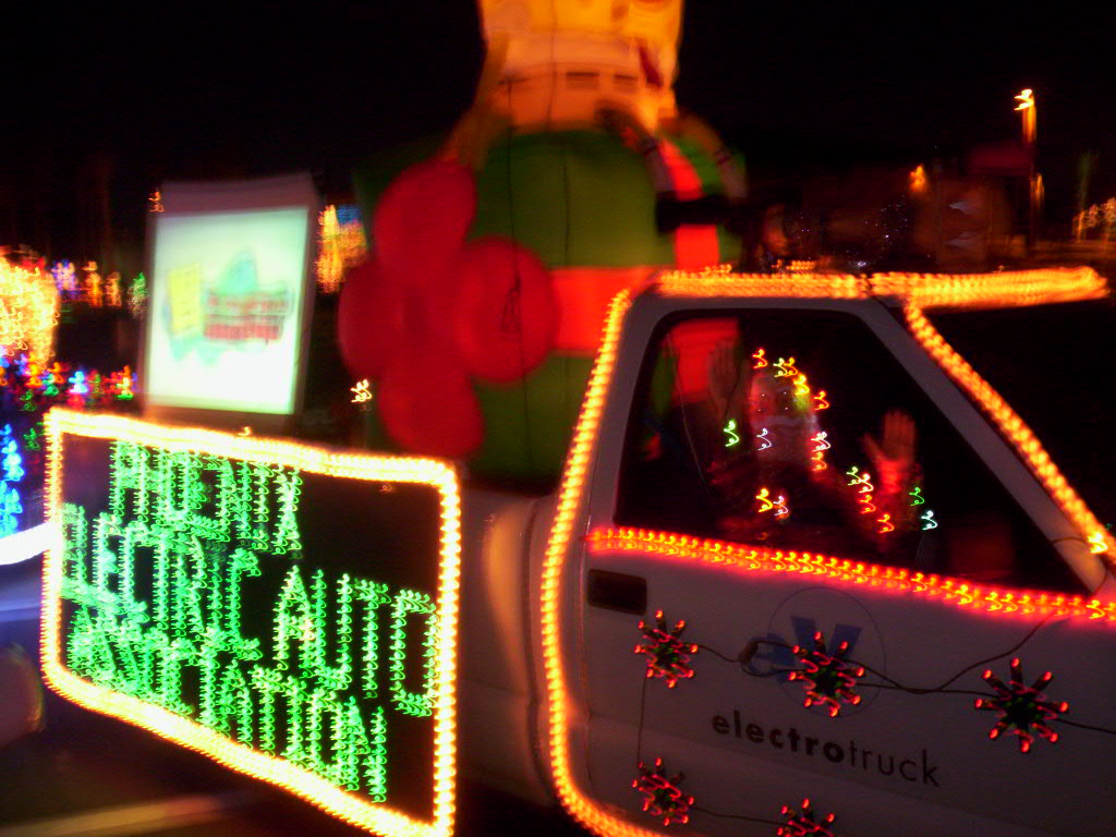 "We had another intereting light parade this year. There were 4 vehicles from the [Phoenix] EAA participaing this time. Sam had SpongeBob and a video this year playing the entire way, Rick had his cool Saturn EV with some of the brightest LED rope lights in the country, his Mom and Dad had the largest inflatable Santa in the parade riding on their GEM NEV and Elaine and Laura drove our '05 Prius almost all the way on electric only. I was the walker and got a few nice pictures." - Jim Stack